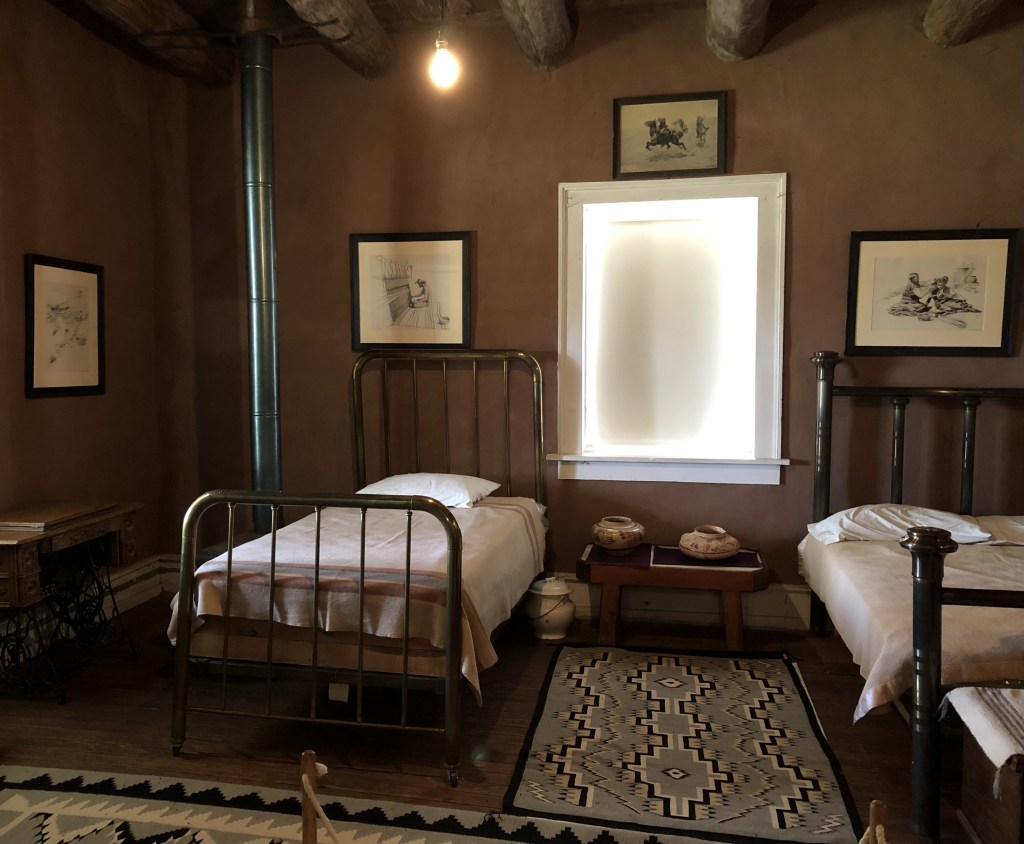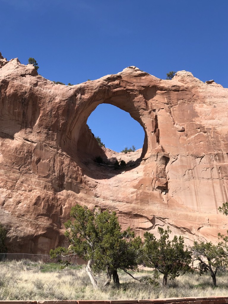 My route home curved north of the Painted Desert, through the heart of the Navajo nation. I paused briefly to absorb the history of the Hubbell Trading Post (nearly 150 years old) by stepping into historic buildings filled with blankets and baskets both new and old. At the state line I found Window Rock and a lovely Navajo woman, selling jewelry from her folding table near the rock. After a chat, I bought a bracelet and earrings ($10) that I still treasure.